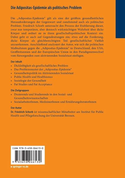 Die "Adipositas-Epidemie" gilt als eine der größten gesundheitspolitischen Herausforderungen der Gegenwart und zunehmend auch als politisches Problem. Die Studie untersucht den Prozess der Etablierung dieser, zwar nur temporären, aber dennoch wirkmächtigen Wahrheit über dicke Körper und ordnet sie in ihren gesellschaftspolitischen Kontext ein. Dabei wird auch auf Gegendeutungen eingegangen; etwa auf die Forderung, dicke Körper als gleichberechtigten Teil gesellschaftlicher Vielfalt anzuerkennen. Anschließend wird analysiert, wie sich die politischen Maßnahmen gegen die "Adipositas-Epidemie" in Deutschland, den USA, Großbritannien und der Europäischen Union in den Paradigmenwechsel vom fürsorgenden zum aktivierenden Sozialstaat einfügen.