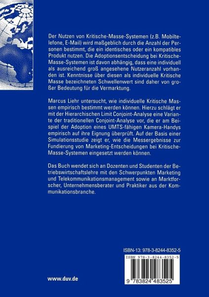 Marcus Liehr untersucht, wie individuelle Kritische Massen empirisch bestimmt werden können. Hierzu schlägt er mit der Hierarchischen Limit Conjoint-Analyse eine Variante der traditionellen Conjoint-Analyse vor, die er am Beispiel der Adoption eines UMTS-fähigen Kamera-Handys empirisch auf ihre Eignung überprüft. Auf der Basis einer Simulationsstudie zeigt er, wie die Messergebnisse zur Fundierung von Marketing-Entscheidungen bei Kritische-Masse-Systemen eingesetzt werden können.