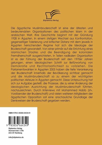 Die ägyptische Muslimbruderschaft ist eine der ältesten und bedeutendsten Organisationen des politischen Islam in der arabischen Welt. Ihre Geschichte beginnt mit der Gründung 1928 in Ägypten. In einem stetigen Wechsel aus Konfrontation, gegenseitiger Tolerierung und kritischer Distanz mit dem jeweils in Ägypten herrschenden Regime hat sich die Ideologie der Bruderschaft gewandelt. Von einer primär auf die Errichtung eines islamischen Staates und die Beendigung der kolonialen Fremdherrschaft ausgerichteten in Teilen radikalen Organisation ist es der Führung der Bruderschaft seit den 1970er Jahren gelungen, einen ideologischen Schritt zur Befürwortung von Demokratie und Rechtsstaatlichkeit zu vollziehen. Die Parlamentswahlen in Ägypten 2005 haben die tiefe Verankerung der Bruderschaft innerhalb der Bevölkerung sichtbar gemacht und die Muslimbruderschaft so zu einem der wichtigsten politischen Akteure in Ägypten gemacht. Diese Arbeit hat sich zur Aufgabe gestellt, die Prozesse, diezu einer Änderung der ideologischen Ausrichtung der Muslimbruderschaft führten nachzuzeichnen. Durch Interviews mit Mohammed Habib (stv. Vorsitzender der Bruderschaft) und vielen weiteren Mitgliedern der ägyptischen Opposition soll eine anschauliche Grundlage der Denkweisen der Bruderschaft gegeben werden.