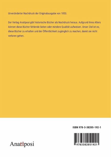 Unveränderter Nachdruck der Originalausgabe von 1853. Der Verlag Anatiposi gibt historische Bücher als Nachdruck heraus. Aufgrund ihres Alters können diese Bücher fehlende Seiten oder mindere Qualität aufweisen. Unser Ziel ist es, diese Bücher zu erhalten und der Öffentlichkeit zugänglich zu machen, damit sie nicht verloren gehen.
