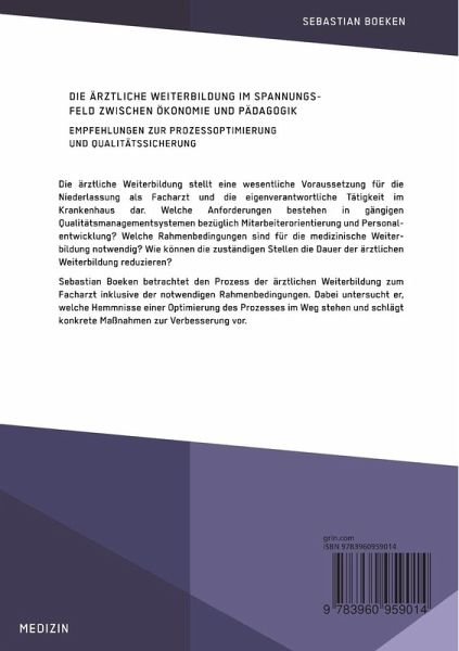 Die ärztliche Weiterbildung stellt eine wesentliche Voraussetzung für die Niederlassung als Facharzt und die eigenverantwortliche Tätigkeit im Krankenhaus dar. Welche Anforderungen bestehen in gängigen Qualitätsmanagementsystemen bezüglich Mitarbeiterorientierung und Personalentwicklung? Welche Rahmenbedingungen sind für die medizinische Weiterbildung notwendig? Wie können die zuständigen Stellen die Dauer der ärztlichen Weiterbildung reduzieren?Sebastian Boeken betrachtet den Prozess der ärztlichen Weiterbildung zum Facharzt inklusive der notwendigen Rahmenbedingungen. Dabei untersucht er, welche Hemmnisse einer Optimierung des Prozesses im Weg stehen und schlägt konkrete Maßnahmen zur Verbesserung vor. Aus dem Inhalt:-Prozessoptimierung;-Qualitätsmanagement;-Reduzierung des Fachkräftemangels;-Human Resources;-Ärztekammer
