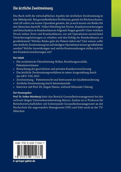 Das Buch stellt die wirtschaftlichen Aspekte der ärztlichen Zweitmeinung in den Mittelpunkt. Bei gesundheitlichen Problemen, gerade bei Rückenschmerz, wird oft sofort zur teuren Operation geraten, die ja auch immer ein Risiko für den Menschen darstellt. Volker Nürnberg hat Ärzte, Krankenversicherungen und Entscheider in Krankenhäusern folgende Fragen gestellt: Unter welchem Druck stehen Ärzte und Krankenhäusern, um mit Operationen ausreichend Versicherungsleistungen zu erhalten und den Erfolg des Krankenhauses zu gewährleisten? Welches Risiko geht der Patient dabei ein? Und warum sollte eine ärztliche Zweitmeinung bei aufwändigen Operationen immer gewährleistet werden? Welche Auswirkungen und welche Kostensenkungen stellen sich bei den Krankenversicherungen ein?