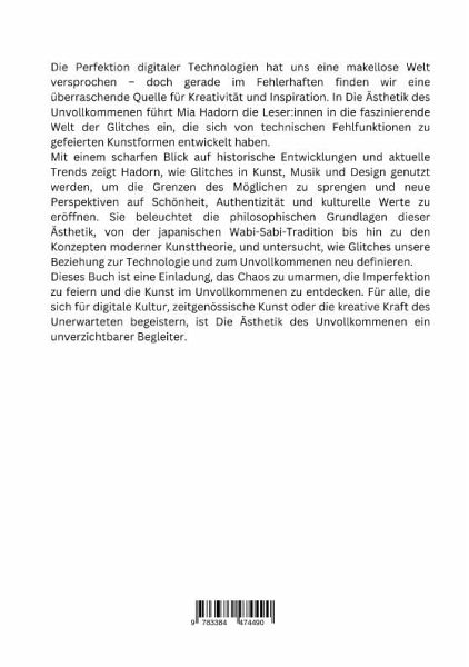 Die Perfektion digitaler Technologien hat uns eine makellose Welt versprochen - doch gerade im Fehlerhaften finden wir eine überraschende Quelle für Kreativität und Inspiration. In Die Ästhetik des Unvollkommenen führt Mia Hadorn die Leser:innen in die faszinierende Welt der Glitches ein, die sich von technischen Fehlfunktionen zu gefeierten Kunstformen entwickelt haben.Mit einem scharfen Blick auf historische Entwicklungen und aktuelle Trends zeigt Hadorn, wie Glitches in Kunst, Musik und Design genutzt werden, um die Grenzen des Möglichen zu sprengen und neue Perspektiven auf Schönheit, Authentizität und kulturelle Werte zu eröffnen. Sie beleuchtet die philosophischen Grundlagen dieser Ästhetik, von der japanischen Wabi-Sabi-Tradition bis hin zu den Konzepten moderner Kunsttheorie, und untersucht, wie Glitches unsere Beziehung zur Technologie und zum Unvollkomme-nen neu definieren.Dieses Buch ist eine Einladung, das Chaos zu umarmen, die Imperfektion zu feiern und die Kunst im Unvollkommenen zu entdecken. Für alle, die sich für digitale Kultur, zeitge-nössische Kunst oder die kreative Kraft des Unerwarteten begeistern, ist Die Ästhetik des Unvollkommenen ein unverzichtbarer Begleiter.