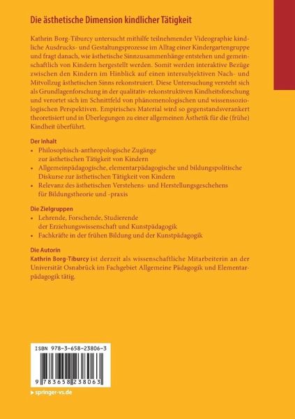 Kathrin Borg-Tiburcy untersucht mithilfe teilnehmender Videographie kindliche Ausdrucks- und Gestaltungsprozesse im Alltag einer Kindergartengruppe und fragt danach, wie ästhetische Sinnzusammenhänge entstehen und gemeinschaftlich von Kindern hergestellt werden. Somit werden interaktive Bezüge zwischen den Kindern im Hinblick auf einen intersubjektiven Nach- und Mitvollzug ästhetischen Sinns rekonstruiert. Diese Untersuchung versteht sich als Grundlagenforschung in der qualitativ-rekonstruktiven Kindheitsforschung und verortet sich im Schnittfeld von phänomenologischen und wissenssoziologischen Perspektiven. Empirisches Material wird so gegenstandsverankert theoretisiert und in Überlegungen zu einer allgemeinen Ästhetik für die (frühe) Kindheit überführt.