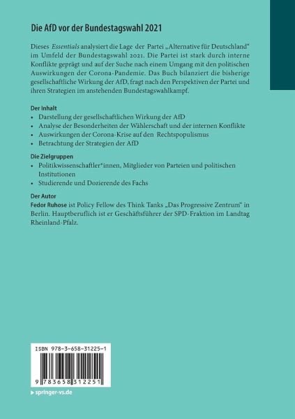 Dieses Essentials analysiert die Lage der Partei "Alternative für Deutschland" im Umfeld der Bundestagswahl 2021. Die Partei ist stark durch interne Konflikte geprägt und auf der Suche nach einem Umgang mit den politischen Auswirkungen der Corona-Pandemie. Das Buch bilanziert die bisherige gesellschaftliche Wirkung der AfD, fragt nach den Perspektiven der Partei und ihren Strategien im anstehenden Bundestagswahlkampf.