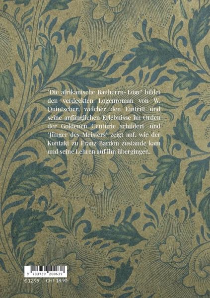 "Die afrikanische Bauherrn-Loge" bildet den verdeckten Logenroman von W. Quintscher, welcher den Eintritt und seine anfänglichen Erlebnisse im Orden der Goldenen Centurie schildert und "Jünger des Meisters" zeigt auf, wie der Kontakt zu Franz Bardon zustande kam und seine Lehren auf ihn übergingen.
