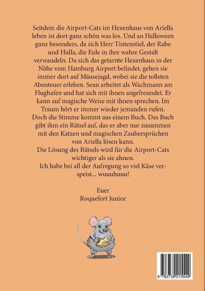 Seitdem die Airport-Cats im verborgenen Hexenhaus von Ariella leben, ist dort ganz schön was los. Und an Halloween ganz besonders, da sich Herr Tintenstiel, der Rabe und Hulla, die kleine Eule in wahre Gestalt verwandeln. Das getarnte Hexenhaus befindet sich in der Nähe vom Hamburg Airport, wo die Vier Wollknäuel Feli, Emma Mautz und Piet stets auf Mäusejagd gehen. In der Halloween-Nacht erleben sie dort eines ihrer gruseligste Abenteuer.Und dann wird auch noch ihr Freund Sean, der Wachmann vom Hamburg Airport, im Traum von einer Stimme aus dem Nichts heimgesucht. Ein sprechendes Buch gibt ihm ein Rätsel auf, was er nur gemeinsam mit der Hexe Ariella, ihrem Bruder Rumbold und den Airport-Cats lösen kann.Die Airport-Cats ahnen nicht, wie wichtig die Lösung des Rätsels für sie sein wird.All das wird erzählt von einer kleinen dicken Maus namens Roquefort junior, die beim Erzählen das eine oder andere Stückchen Käse oder Speck verspeist.