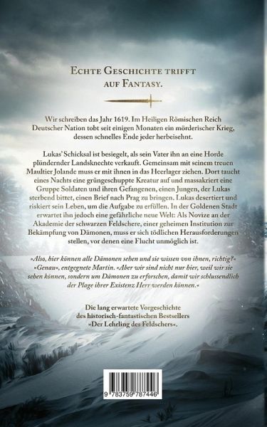 Wir schreiben das Jahr 1619. Im Heiligen Römischen Reich Deutscher Nation tobt seit einigen Monaten ein mörderischer Krieg, dessen schnelles Ende jeder herbeisehnt. Lukas' Schicksal ist besiegelt, als sein Vater ihn an eine Horde plündernder Landsknechte verkauft. Gemeinsam mit seinem treuen Maultier Jolande muss er mit ihnen in das Heerlager ziehen. Dort taucht eines Nachts eine grüngeschuppte Kreatur auf und massakriert eine Gruppe Soldaten und ihren Gefangenen, einen Jungen, der Lukas sterbend bittet, einen Brief nach Prag zu bringen. Lukas desertiert und riskiert sein Leben, um die Aufgabe zu erfüllen. In der Goldenen Stadt erwartet ihn jedoch eine gefährliche neue Welt: Als Novize an der Akademie der schwarzen Feldschere, einer geheimen Institution zur Bekämpfung von Dämonen, muss er sich tödlichen Herausforderungen stellen, vor denen eine Flucht unmöglich ist. "Also, hier können alle Dämonen sehen und sie wissen von ihnen, richtig?" "Genau", entgegnete Martin. "Aber wir sind nicht nur hier, weil wir sie sehen können, sondern um Dämonen zu erforschen, damit wir schlussendlich der Plage ihrer Existenz Herr werden können." Die lang erwartete Vorgeschichte des historisch-fantastischen Bestsellers "Der Lehrling des Feldschers".