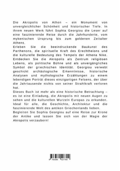 Die Akropolis von Athen - ein Monument von unvergleichlicher Schönheit und historischer Tiefe. In ihrem neuen Werk führt Sophia Georgiou die Leser auf eine faszinierende Reise durch die Jahrhunderte, vom mykenischen Ursprung bis zum goldenen Zeitalter Athens.Erleben Sie die beeindruckende Baukunst des Parthenons, die spirituelle Kraft des Erechtheions und die kulturelle Bedeutung des Tempels der Athena Nike. Entdecken Sie die Akropolis als Zentrum religiösen Lebens, als politische Bühne und als unvergängliches Symbol der griechischen Identität. Georgiou verwebt geschickt archäologische Erkenntnisse, historische Analysen und mythologische Erzählungen zu einem lebendigen Porträt dieses einzigartigen Felsens, der über die Jahrtausende nichts von seiner Strahlkraft verloren hat.Dieses Buch ist mehr als eine historische Betrachtung - es ist eine Einladung, die Akropolis mit neuen Augen zu sehen und die kulturellen Wurzeln Europas zu erkunden. Ideal für alle, die Geschichte, Architektur und die faszinierende Welt des antiken Griechenlands lieben.Begleiten Sie Sophia Georgiou auf eine Reise zur Krone der Antike und lassen Sie sich von der Magie der Akropolis verzaubern!