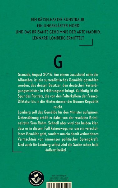 Granada im Sommer 2016. Bei einem Einbruch in ein Luxushotel nahe der Alhambra ist ein surrealistisches Gemälde gestohlen worden, das dessen Besitzer, den deutschen Verteidigungsminister, in große Erklärungsnot bringt. Zu blutig ist die Spur des Gemäldes, die von den Folterkellern der Franco-Diktatur bis in die Ministerien der Bonner Republik reicht.