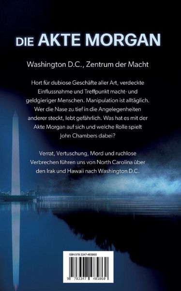 Washington D.C., Zentrum der Macht. Hort für dubiose Geschäfte aller Art, verdeckte Einflussnahme und Treffpunkt macht- und geldgieriger Menschen. Manipulation ist alltäglich. Wer die Nase zu tief in die Angelegenheiten anderer steckt, lebt gefährlich. Was hat es mit der Akte Morgan auf sich und welche Rolle spielt John Chambers dabei? Verrat, Vertuschung, Mord und ruchlose Verbrechen führen von North Carolina über den Irak und Hawaii nach Washington D.C.