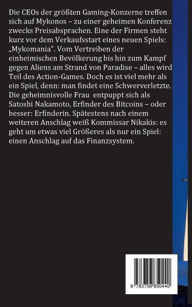 Die CEOs der größten Gaming-Konzerne treffen sich auf Mykonos zu einer geheimen Konferenz zwecks Preisabsprachen. Eine der Firmen steht kurz vor dem Verkaufsstart eines neuen Spiels: Mykomania. Vom Vertreiben der einheimischen Bevölkerung bis hin zum Kampf gegen Aliens am Strand von Paradise. Alles wird Teil des Action-Games. Doch es ist viel mehr als ein Spiel, denn man findet eine Schwerverletzte, Opfer eines Unfalls mit Fahrerflucht. Die geheimnisvolle Frau entpuppt sich als Satoshi Nakamoto, Erfinder des Bitcoins. Oder besser Erfinderin. Spätestens nach einem weiteren Anschlag weiß Kommissar Nikakis: es geht um etwas viel Größeres als nur ein Spiel: einen Anschlag auf das Finanzsystem.