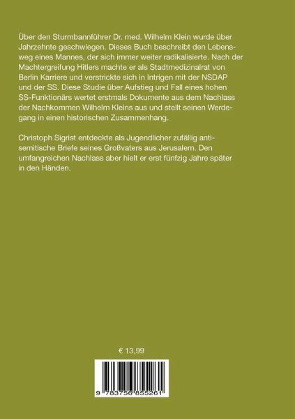 Über den Sturmbannführer Dr. med. Wilhelm Klein wurde über Jahrzehnte geschwiegen. Dieses Buch beschreibt den Lebensweg eines Mannes, der sich immer weiter radikalisierte. Nach der Machtergreifung Hitlers machte er als Stadtmedizinalrat von Berlin Karriere und verstrickte sich in Intrigen mit der NSDAP und SS. Diese Studie über Aufstieg und Fall eines hohen SS-Funktionärs wertet erstmals Dokumente aus dem Nachlass der Nachkommen Wilhelm Kleins aus und stellt seinen Werdegang in einen historischen Zusammenhang.