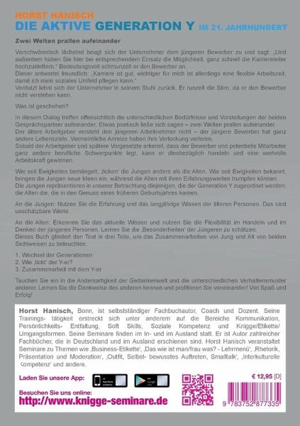 Zwei Welten prallen aufeinander.Verschwörerisch lächelnd beugt sich der Unternehmer dem jüngeren Bewerber zu und sagt: "Und außerdem haben Sie hier bei entsprechendem Einsatz die Möglichkeit, ganz schnell die Karriereleiter hochzuklettern." Bedeutungsvoll schmunzelt er den Bewerber an.Dieser antwortet freundlich: "Karriere ist gut, wichtiger für mich ist allerdings eine flexible Arbeitszeit, damit ich mein soziales Umfeld pflegen kann."Verdutzt lehnt sich der Unternehmer in seinem Stuhl zurück. Er runzelt die Stirn, da er den Bewerber nicht verstehen kann.Was ist geschehen?In diesem Dialog treffen offensichtlich die unterschiedlichen Bedürfnisse und Vorstellungen der beiden Gesprächspartner aufeinander. Etwas poetisch ließe sich sagen - zwei Welten prallen aufeinander.Der ältere Arbeitgeber versteht den jüngeren Arbeitnehmer nicht - der jüngere Bewerber hat ganz andere Lebensziele. Vermeintliche Anreize haben ihre Verlockung verloren.Sobald der Arbeitgeber und spätere Vorgesetzteerkennt, dass der Bewerber und potentielle Mitarbeiter ganz andere berufliche Schwerpunkte legt, kann er diesbezüglich handeln und eine wertvolle Arbeitskraft gewinnen.Wie seit Ewigkeiten bemängelt, 'ticken' die Jungen anders als die Alten. Wie seit Ewigkeiten bekannt, bringen die Jungen neue Ideen ein, während die Alten mit ihren Erfahrungswerten trumpfen können.Die Jungen repräsentieren in unserer Betrachtung diejenigen, die der Generation Y zugeordnet werden; die Alten die, die in den Genuss eines früheren Geburtsjahres kamen.An die Jungen: Nutzen Sie die Erfahrung und das langjährige Wissen der älteren Personen. Das sind unschätzbare Werte.An die Alten: Erkennen Sie das aktuelle Wissen und nutzen Sie die Flexibilität im Handeln und im Denken der jüngeren Personen. Lernen Sie die 'Besonderheiten' der Jüngeren zu schätzen.Dieses Buch gliedert den Text in drei Teile, um das Zusammenarbeiten von Jung und Alt von beiden Sichtweisen zu beleuchten.1. Wechsel der Generationen2. Wie 'tickt' der Y-er?3. Zusammenarbeit mit dem Y-erTauchen Sie ein in die Andersartigkeit der Gedankenwelt und die unterschiedlichen Verhaltensmuster anderer. Lernen Sie die Denkweise des anderen kennen und profitieren Sie voneinander! Viel Spaß und Erfolg!