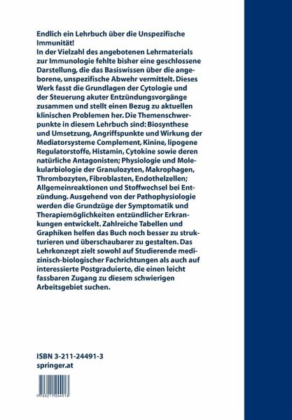 In der Vielfalt an angebotenem Lehrmaterial zur Immunologie fehlt eine Darstellung, die das Basiswissen über die Unspezifische Immunität auf universitärem Niveau vermittelt. Diese Lücke soll dieses Buch schließen, das die Grundlagen der Zytologie und Steuerung der Akuten Entzündung zusammenfasst und einen Bezug zu aktuellen klinischen Problemen herstellt. Themenschwerpunkte sind: Biosynthese, Abbau, Chemie und Wirkung der Mediatorsysteme Complement, Kallikrein-Kinin, lipogene Regulatorstoffe, Histamin, Cytokine und ihre natürlichen Antagonisten; Physiologie und Molekularbiologie der Granulozyten, Makrophagen, Thrombozyten, Fibroblasten und Endothelzellen; Stoffwechsel und Allgemeinreaktionen bei Entzündung. Von der Pathophysiologie ausgehend werden Symptomatik und Therapiemöglichkeiten entzündlicher Erkrankungen entwickelt. Zielgruppen sind Studierende medizinisch-biologischer Fachrichtungen, aber auch Postgraduierte, die einen leicht fassbaren Zugang zu diesem schwierigen Arbeitsgebiet suchen.