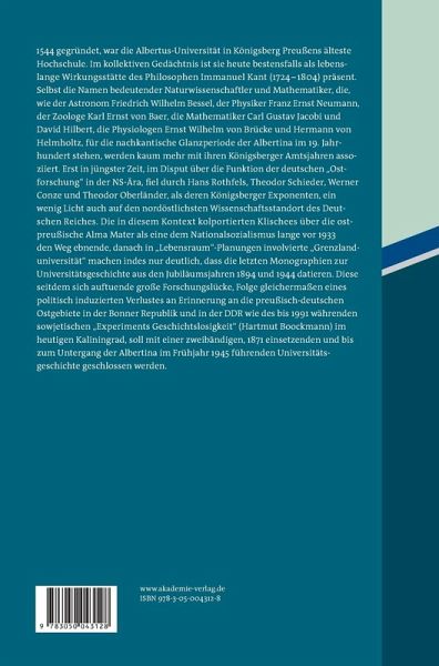 1544 gegründet, war die Albertus-Universität in Königsberg Preußens älteste Hochschule. Im kollektiven Gedächtnis ist sie heute als lebenslange Wirkungsstätte des Philosophen Immanuel Kant (1724-1804) präsent. Auch die Namen bedeutender Naturwissenschaftler und Mathematiker, die, wie der Astronom Friedrich Wilhelm Bessel, der Physiker Franz Ernst Neumann, der Zoologe Karl Ernst von Baer, die Mathematiker Carl Gustav Jacobi und David Hilbert, die Physiologen Ernst Wilhelm von Brücke und Hermann von Helmholtz, für die nachkantische Glanzperiode der Albertina im19. Jahrhundert stehen, werden mit ihren Königsberger Amtsjahren assoziiert. Im Disput über die "Ostforschung" in der NS-Ära fiel ein wenig günstiges Licht auf den nordöstlichsten Wissenschaftsstandort des Deutschen Reiches, dessen Alma Mater in den Ruch einer dem Nationalsozialismus lange vor 1933 den Weg ebnende, danach in "Lebensraum"-Planungen involvierte "Grenzlanduniversität" geriet. Die letzten Monographie zur Universitätsgeschichte datiert aus dem Jubiläumsjahr 1944. Diese Forschungslücke, Folge gleichermaßen des Erinnerungsverlustes an die preußisch-deutsche Geschichte Königsbergs wie des bis 1991 währenden sowjetischen "Experiments Geschichtslosigkeit" (Hartmut Boockmann) im heutigen Kaliningrad, soll mit dieser 1871 einsetzenden und bis zum Untergang der Albertina im Frühjahr 1945 führenden Universitätsgeschichte geschlossen werden, deren erster Band hier vorgelegt wird.