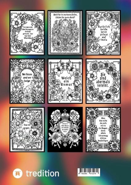 Das Malbuch der etwas anderen Art. "Die Allegorie der Abgründe im Schatten des Banalen" thematisiert sprachliche Fragmente des Zeitgeistes und verziert sie mit mittelalterlich anmutenden Blumenkränzen. Es entfaltet sich ein modernes Epos, das die Höhen und Tiefen eines toxischen Beziehungsdramas schildert. Betrug, öffentliche Schlammschlachten und die theatrale Versöhnung zweier Herzen, deren Geschichte das Netz mit Memes und Diskussionen durchzog, stehen im Fokus. Mit feiner Ironie und einem Hauch mittelalterlicher Sprachkunst wurden ausgewählte Kommentarspalten in altertümliche Rhetorik gehüllt, wodurch die digitale Tragikomödie in neuem Glanz erstrahlt. Ein Werk, das die absurden Abgründe unserer Zeit kunstvoll beleuchtet und nur von denen verstanden werden kann, die sich im Trash-TV und in den Kommentarspalten zu Hause fühlen.