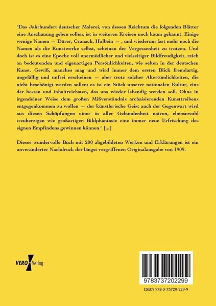 "Das Jahrhundert deutscher Malerei, von dessen Reichtum die folgenden Blätter eine Anschauung geben sollen, ist in weiteren Kreisen noch kaum gekannt. Einige wenige Namen Dürer, Cranach, Holbein , und wiederum fast mehr noch die Namen als die Kunstwerke selbst, scheinen der Vergessenheit zu trotzen. Und doch ist es eine Epoche voll unermüdlicher und vielseitiger Bildfreudigkeit, reich an bedeutenden und eigenartigen Persönlichkeiten, wie selten in der deutschen Kunst. Gewiß, manches mag und wird immer dem ersten Blick fremdartig, ungefällig und unfrei erscheinen aber trotz solcher Altertümlichkeiten, die nicht beschönigt werden sollen: es ist ein Stück unserer nationalen Kultur, eins der besten und inhaltreichsten, das uns wieder lebendig werden soll. Ohne in irgendeiner Weise dem großen Mißverständnis archaisierenden Kunsttreibens entgegenkommen zu wollen der künstlerische Geist auch der Gegenwart wird aus diesen Schöpfungen einer in aller Gebundenheit naiven, ebensowohl treuherzigen wie großartigen Bildphantasie eine immer neue Erfrischung des eignen Empfindens gewinnen können." [...]
