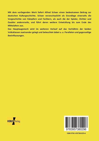 Mit dem vorliegenden Werk liefert Alfred Schaer einen bedeutsamen Beitrag zur deutschen Kulturgeschichte. Schaer veranschaulicht als Grundlage einerseits die Vorgeschichte von Kämpfern und Fechtern, als auch die der Spieler, Dichter und Gaukler andererseits, und führt deren weitere Entwicklung bis zum Ende des Mittelalters aus.