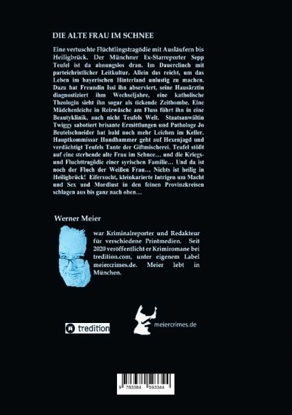 Werner Meier Der gebürtige Landshuter volontierte beim Straubinger Tagblatt, war Kriminalreporter bei der Münchner Abendzeitung und der Illustrierten Quick, arbeitete danach freiberuflich für diverse Illustrierte, als Autor für Ferenczy Presse Agentur, war in seinen angestellten Journalistenphasen leitender Redakteur, später Inhaber einer Presseagentur. Zwischendurch schrieb er Kinderkrimis für Loewes Verlag und setzte Drehbücher in Romanform um. Seine Gegenwartskrimis erscheinen unter seinem eigenen label meiercrimes.de bei tredition.com, in jeweils brandaktuellem Handlungsrahmen. Dabei setzt der Autor tatsächliche Ereignisse in erfundene Zusammenhänge seiner Mordfälle, schwarzhumorig mit schrägen Typen und bissiger Beschreibung von Gesellschaft und Politik in Zeiten galoppierender Krisen. "Wobei Wirklichkeit ständig meine Fantasie überholt." Sagt der Autor. Meier lebt in München.