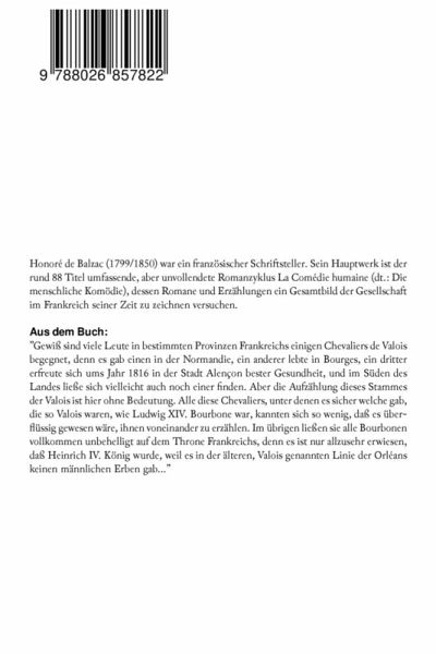 Honoré de Balzac (1799/1850) war ein französischer Schriftsteller. Sein Hauptwerk ist der rund 88 Titel umfassende, aber unvollendete Romanzyklus La Comédie humaine (dt.: Die menschliche Komödie), dessen Romane und Erzählungen ein Gesamtbild der Gesellschaft im Frankreich seiner Zeit zu zeichnen versuchen. Aus dem Buch: "Gewiß sind viele Leute in bestimmten Provinzen Frankreichs einigen Chevaliers de Valois begegnet, denn es gab einen in der Normandie, ein anderer lebte in Bourges, ein dritter erfreute sich ums Jahr 1816 in der Stadt Alençon bester Gesundheit, und im Süden des Landes ließe sich vielleicht auch noch einer finden. Aber die Aufzählung dieses Stammes der Valois ist hier ohne Bedeutung. Alle diese Chevaliers, unter denen es sicher welche gab, die so Valois waren, wie Ludwig XIV. Bourbone war, kannten sich so wenig, daß es überflüssig gewesen wäre, ihnen voneinander zu erzählen. Im übrigen ließen sie alle Bourbonen vollkommen unbehelligt auf dem Throne Frankreichs, denn es ist nur allzusehr erwiesen, daß Heinrich IV. König wurde, weil es in der älteren, Valois genannten Linie der Orléans keinen männlichen Erben gab..."