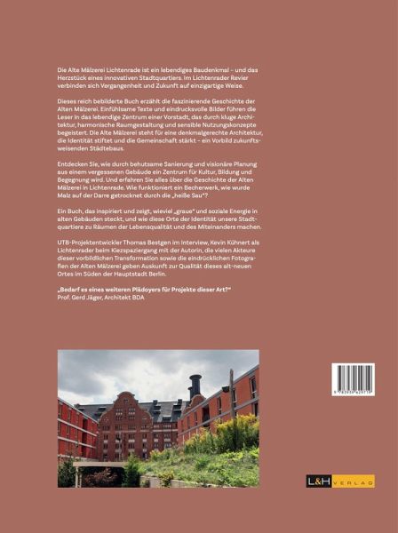 Die Alte Mälzerei Lichtenrade ist ein lebendiges Baudenkmal und das Herzstück eines innovativen Stadtquartiers. Im Lichtenrader Revier verbinden sich Vergangenheit und Zukunft auf einzigartige Weise. Dieses reich bebilderte Buch erzählt die faszinierende Geschichte der Alten Mälzerei. Einfühlsame Texte und eindrucksvolle Bilder führen die Leser in das lebendige Zentrum einer Vorstadt, das durch kluge Architektur, harmonische Raumgestaltung und sensible Nutzungskonzepte begeistert. Die Alte Mälzerei steht für eine denkmalgerechte Architektur, die Identität stiftet und die Gemeinschaft stärkt - ein Vorbild zukunftsweisenden Städtebaus.Entdecken Sie, wie durch behutsame Sanierung und visionäre Planung aus einem vergessenen Gebäude ein Zentrum für Kultur, Bildung und Begegnung wird. Und erfahren Sie alles über die Geschichte der Alten Mälzerei in Lichtenrade. Wie funktioniert ein Becherwerk, wie wurde Malz auf der Darre getrocknet durch die "heiße Sau"? Ein Buch, das inspiriert und zeigt, wie viel "graue" und soziale Energie in alten Gebäuden steckt, und wie diese Orte der Identität unsere Stadtquartiere zu Räumen der Lebensqualität und des Miteinanders machen. UTB-Projektentwickler Thomas Bestgen im Interview, Kevin Kühnert als Lichtenrader beim Kiezspaziergang mit der Autorin, die vielen Akteure dieser vorbildlichen Transformation sowie die eindrücklichen Fotografien der Alten Mälzerei geben Auskunft zur Qualität dieses alt-neuen Ortes im Süden der Hauptstadt Berlin."Bedarf es eines weiteren Plädoyers für Projekte dieser Art?"Prof. Gerd Jäger, Architekt BDA
