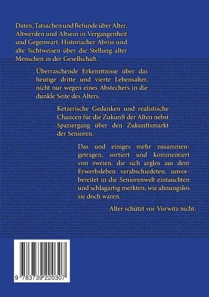 Daten, Tatsachen und Befunde über das Altwerden und das Altsein in Vergangenheit und Gegenwart. Historischer Abriss über die Stellung alter Menschen und überraschende Erkenntnisse über das heutige dritte und vierte Lebensalter.Ketzerische Gedanken und neue Chancen für die Zukunft der Alten.Geschrieben von zweien, die sich aus dem Erwerbsleben verabschiedeten, unvorbereitet in die Seniorenwelt eintauchten und schlagartig merkten, wie ahnungslos sie waren.