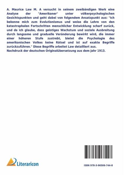 A. Maurice Law M. A versucht in seinem zweibändigen Werk eine Analyse der "Amerikaner" unter völkerpsychologischen Gesichtspunkten und geht dabei von folgendem Ansatzpunkt aus: "Ich bekenne mich zum Evolutionismus und weise die Lehre von den katastrophalen Fortschritten menschlicher Entwicklung scharf zurück, und da ich glaube, dass geistiges Wachstum und soziale Ausbreitung durch langsame und graduelle Veränderung bewirkt wird, die immer einer höheren Stufe zustrebt, bietet die Psychologie des amerikanischen Volkes keine Rätsel und ist auf exakte Begriffe zurückzuführen." Diese Begriffe arbeitet Law detailliert aus. Nachdruck der deutschen Originalübersetzung aus dem Jahr 1913.