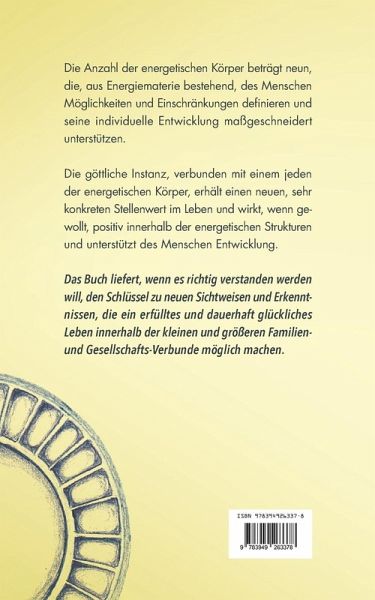 Die Anzahl der energetischen Körper beträgt neun, die, aus Energiematerie bestehend, des Menschen Möglichkeiten und Einschränkungen definieren und seine individuelle Entwicklung maßgeschneidert unterstützen. Die göttliche Instanz, verbunden mit einem jeden der energetischen Körper, erhält einen neuen, sehr konkreten Stellenwert im Leben und wirkt, wenn gewollt, positiv innerhalb der energetischen Strukturen und unterstützt des Menschen Entwicklung. Das Buch liefert, wenn es richtig verstanden werden will, den Schlüssel zu neuen Sichtweisen und Erkenntnissen, die ein erfülltes und dauerhaft glückliches Leben innerhalb der kleinen und größeren Familien- und Gesellschafts-Verbunde möglich machen.