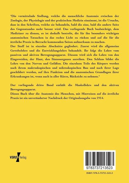 Der vorliegende dritte Band enthält die Muskellehre und den aktiven Bewegungsapparat.