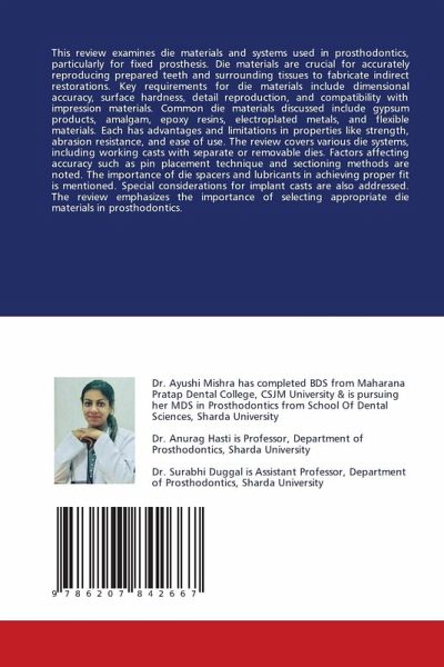 This review examines die materials and systems used in prosthodontics, particularly for fixed prosthesis. Die materials are crucial for accurately reproducing prepared teeth and surrounding tissues to fabricate indirect restorations. Key requirements for die materials include dimensional accuracy, surface hardness, detail reproduction, and compatibility with impression materials. Common die materials discussed include gypsum products, amalgam, epoxy resins, electroplated metals, and flexible materials. Each has advantages and limitations in properties like strength, abrasion resistance, and ease of use. The review covers various die systems, including working casts with separate or removable dies. Factors affecting accuracy such as pin placement technique and sectioning methods are noted. The importance of die spacers and lubricants in achieving proper fit is mentioned. Special considerations for implant casts are also addressed. The review emphasizes the importance of selecting appropriate die materials in prosthodontics.