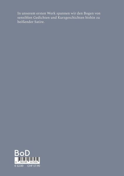 In unserem ersten Werk spannen den Bogen von sensiblen, teilweise gesellschaftskritischen Gedichten und Kurzgeschichten bis hin zu beißender Satire.