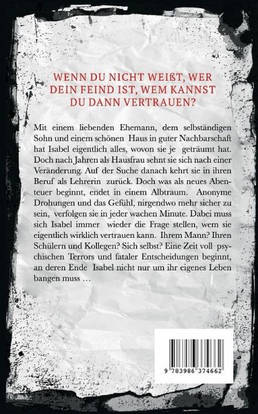 Wenn du nicht weißt, wer dein Feind ist, wem kannst du dann vertrauen? Der fesselnde Psychothriller mit Gänsehaut-Garantie Mit einem liebenden Ehemann, dem selbständigen Sohn und einem schönen Haus in guter Nachbarschaft hat Isabel eigentlich alles, wovon sie je geträumt hat. Doch nach Jahren als Hausfrau sehnt sie sich nach einer Veränderung. Auf der Suche danach kehrt sie in ihren Beruf als Lehrerin zurück. Doch was als neues Abenteuer beginnt, endet in einem Albtraum. Anonyme Drohungen und das Gefühl, nirgendwo mehr sicher zu sein, verfolgen sie in jeder wachen Minute. Dabei muss sich Isabel immer wieder die Frage stellen, wem sie eigentlich wirklich vertrauen kann. Ihrem Mann? Ihren Schülern und Kollegen? Sich selbst? Eine Zeit voll psychischem Terror und fatalen Entscheidungen beginnt, an deren Ende Isabel nicht nur um ihr eigenes Leben bangen muss … Dies ist eine überarbeitete Neuauflage des bereits erschienenen Titels Am Ende das Nichts. Erste Leser:innenstimmen „Fesselnder Psychothriller mit überraschendem Ende - stark!" „So in den Bann ziehend geschrieben, man weiß selbst gar nicht mehr was man glauben soll …" „Spannend, dramatisch, geheimnisvoll und eine klare Leseempfehlung." „Ein Thriller mit besonderer Atmosphäre, denn die Bedrohung und Angst schwingt in jeder Zeile mit!"