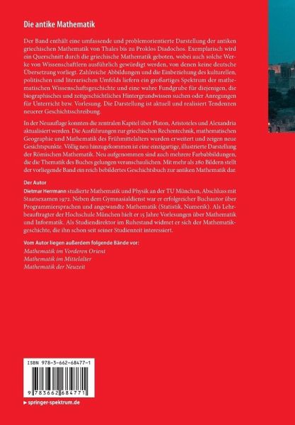 Der Band enthält eine umfassende und problemorientierte Darstellung der antiken griechischen Mathematik von Thales bis zu Proklos Diadochos. Exemplarisch wird ein Querschnitt durch die griechische Mathematik geboten, wobei auch solche Werke von Wissenschaftlern ausführlich gewürdigt werden, von denen keine deutsche Übersetzung vorliegt. Zahlreiche Abbildungen und die Einbeziehung des kulturellen, politischen und literarischen Umfelds liefern ein großartiges Spektrum der mathematischen Wissenschaftsgeschichte und eine wahre Fundgrube für diejenigen, die biographisches und zeitgeschichtliches Hintergrundwissen suchen oder Anregungen für Unterricht bzw. Vorlesung. Die Darstellung ist aktuell und realisiert Tendenzen neuerer Geschichtsschreibung.