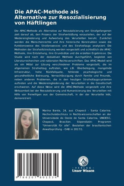 Die APAC-Methode als Alternative zur Resozialisierung von Strafgefangenen zielt darauf ab, den Prozess der Strafverbüßung vorzustellen, der auf der Wiedereingliederung und Aufwertung des Verurteilten beruht. Zunächst werden die Menschenrechte und ihre historische Konstruktion sowie die Funktionsweise des Strafprozesses und des Strafvollzugs analysiert. Die Methoden der Strafvollstreckung werden vorgestellt und schließlich die APAC-Methode, ihre Entstehung, ihre Grundsätze und die erzielten Ergebnisse. Die Studie wird nach der deduktiven Methode durchgeführt, begleitet von Literaturrecherchen und nationalen Rechtsvorschriften. Das APAC-Modell wird als ein Mittel zur Lösung verschiedener Probleme vorgestellt, die im allgemeinen Strafvollzug auftreten, wie z.B. Überbelegung, mangelnde Infrastruktur, hohe Rückfallquote, fehlende psychologische und gesundheitliche Betreuung, Vernachlässigung durch Familie und Freunde, neben anderen Problemen, die in den heutigen Strafvollzugssystemen auftreten und die Wiedereingliederung der Verurteilten in die Gesellschaft erschweren. Auf diese Weise wird die APAC-Methode vorgestellt und ihre Wirksamkeit bei der Resozialisierung und Humanisierung des Verurteilten mit Hilfe von Freiwilligen aus der Gemeinschaft, in der der Verurteilte lebt, demonstriert.