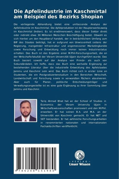 Die vorliegende Abhandlung bietet eine umfassende Analyse der Apfelindustrie im Kaschmirtal. Die Apfelproduktion ist der Haupterwerbszweig im Kaschmirtal (Indien). Es ist erwähnenswert, dass dieser Sektor direkt oder indirekt etwa 30 Millionen Menschen Beschäftigung bietet. Obwohl es sich hierbei um den Hauptberuf handelt, der in beträchtlichem Umfang zum BIP des Staates beiträgt, hat er aufgrund von Unwissenheit seitens der Regierung, mangelnder Infrastruktur und angemessener Marketingkanäle sowie Forschung und Entwicklung noch immer keinen Industriestatus erhalten. Das Buch ist das Ergebnis einer M.Phil-Forschungsarbeit, die an der Wirtschaftsfakultät der Vikram Universität Ujjain durchgeführt wurde. Das Buch basiert sowohl auf der Analyse von Primär- als auch von Sekundärdaten. Ich hoffe, dass das Buch eine wertvolle Ergänzung zur bestehenden Literatur über die industrielle Entwicklung des Apfelstaates Jammu und Kaschmir sein wird. Das Buch richtet sich in erster Linie an Studenten, die ein Postgraduiertenstudium in den Bereichen Wirtschaft, Landwirtschaft und Forschung sowie in verwandten Fächern absolvieren. Aber auch für Planer, politische Entscheidungsträger und Verwaltungsangestellte ist es eine gute Ergänzung zu ihrer Sammlung über Jammu und Kaschmir.