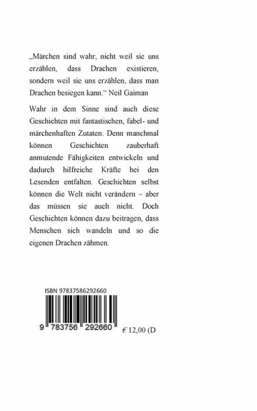 "Märchen sind wahr, nicht weil sie uns erzählen, dass Drachen existieren, sondern weil sie uns erzählen, dass man Drachen besiegen kann." Neil GaimanGeschichten haben viele unterschiedliche, zauberhaft anmutende Fähigkeiten. Diese Weisheits-Weg-Geschichten mit fantastischen, fabel, und märchenhaften Zutaten erzählen von dem weiten Land der Seele: Helikopter König, der Fürst von Fearless, das allerhässlichste Entlein, Schatzsuche, der Wunschbrunnen, die Emotionsesser, die Apotheke der Bücher u.a. Sie können hilfreich sein beim Versuch, die eigenen Drachen zu zähmen.