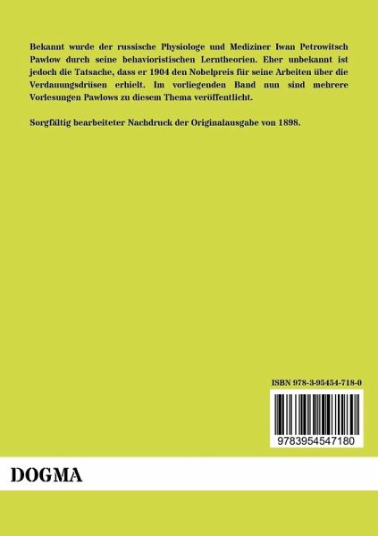 Bekannt wurde der russische Physiologe und Mediziner Iwan Petrowitsch Pawlow durch seine behavioristischen Lerntheorien. Eher unbekannt ist jedoch die Tatsache, dass er 1904 den Nobelpreis für seine Arbeiten über die Verdauungsdrüsen erhielt. Im vorliegenden Band nun sind mehrere Vorlesungen Pawlows zu diesem Thema veröffentlicht.