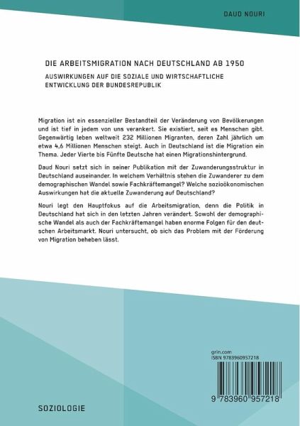 Migration ist ein essenzieller Bestandteil der Veränderung von Bevölkerungen und ist tief in jedem von uns verankert. Sie existiert, seit es Menschen gibt. Gegenwärtig leben weltweit 232 Millionen Migranten, deren Zahl jährlich um etwa 4,6 Millionen Menschen steigt. Auch in Deutschland ist die Migration ein Thema. Jeder Vierte bis Fünfte Deutsche hat einen Migrationshintergrund.Daud Nouri setzt sich in seiner Publikation mit der Zuwanderungsstruktur in Deutschland auseinander. In welchem Verhältnis stehen die Zuwanderer zu dem demographischen Wandel sowie Fachkräftemangel? Welche sozioökonomischen Auswirkungen hat die aktuelle Zuwanderung auf Deutschland?Nouri legt den Hauptfokus auf die Arbeitsmigration, denn die Politik in Deutschland hat sich in den letzten Jahren verändert. Sowohl der demographische Wandel als auch der Fachkräftemangel haben enorme Folgen für den deutschen Arbeitsmarkt. Nouri untersucht, ob sich das Problem mit der Förderung von Migration beheben lässt.Aus dem Inhalt:- Migrationspolitik;- Bevölkerungsschwund;- Entwicklung;- Integration;- Aufnahmegesellschaft