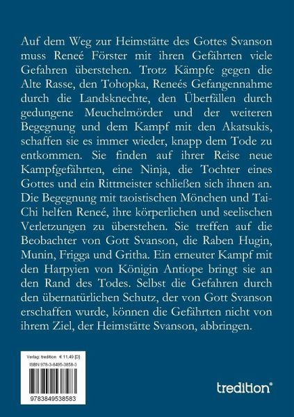 Auf dem Weg zur Heimstätte des Gottes Svanson müssen Reneé Förster und ihre Gefährten viele Gefahren überstehen. Bei Kämpfen gegen die Alte Rasse, die Tohopka, bei Reneés Gefangennahme durch die Landsknechte, beim Überfall durch gedungene Meuchelmörder und bei einer weiteren Begegnung und Kampf gegen die Akatsukis, gelingt es ihnen immer wieder dem Tode zu entkommen, wenn auch manchmal nur knapp. Sie finden neue Kampfgefährten, eine Ninja, die Tochter eines Gottes und ein Rittmeister schließen sich ihnen auf ihrer Reise an. Die Begegnung mit taoistischen Mönchen und Tai-Chi helfen Reneé, ihre körperlichen und seelischen Verletzungen zu überstehen. Sie treffen auf Gott Svansons Beobachter, nämlich die Raben Hugin, Munin, Frigga und Gritha. Ein erneuter Kampf gegen die Harpyien von Königin Antiope bringt sie an den Rand des Todes. Selbst die Gefahren durch den übernatürlichen Schutz, der von Gott Svanson erschaffen wurde, können die Gefährten von ihrem Ziel, die Heimstätte Svansonszu erreichen, nicht abbringen. Kann Reneé dort ihren Vater endlich in die Arme schließen?