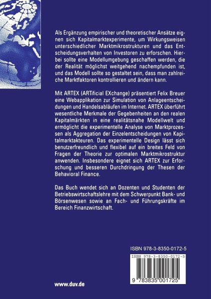 Mit ARTEX (ARTificial EXchange) präsentiert Felix Breuer eine Webapplikation zur Simulation von Anlageentscheidungen und Handelsabläufen im Internet. ARTEX überführt wesentliche Merkmale der Gegebenheiten an den realen Kapitalmärkten in eine realitätsnahe Modellwelt und ermöglicht die experimentelle Analyse von Marktprozessen als Aggregation der Einzelentscheidungen von Kapitalmarktakteuren. Das experimentelle Design lässt sich benutzerfreundlich und flexibel auf ein breites Feld von Fragen der Theorie zur optimalen Marktmikrostruktur anwenden. Insbesondere eignet sich ARTEX zur Erforschung und besseren Durchdringung der Thesen der Behavioral Finance.