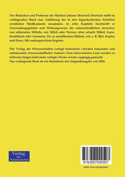 Der Botaniker und Professor der Medizin Johann Heinrich Dierbach stellt im vorliegenden Band eine Auflistung der in den hippokratischen Schriften erwähnten Medikamente zusammen. In zehn Kapiteln beschreibt er Anwendungsgebiete und Wirkungsweise der unterschiedlichen Arzneien, von nährenden Mitteln, wie Milch oder Weizen, über scharfe Mittel, bspw. Knoblauch oder Anemone, bis zu metallischen Mitteln, wie z. B. Blei, Kupfer und Eisen. Mit umfangreichem Register.