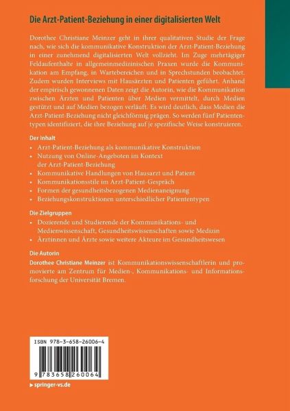 Dorothee Christiane Meinzer geht in ihrer qualitativen Studie der Frage nach, wie sich die kommunikative Konstruktion der Arzt-Patient-Beziehung in einer zunehmend digitalisierten Welt vollzieht. Im Zuge mehrtägiger Feldaufenthalte in allgemeinmedizinischen Praxen wurde die Kommunikation am Empfang, in Wartebereichen und in Sprechstunden beobachtet. Zudem wurden Interviews mit Hausärzten und Patienten geführt. Anhand der empirisch gewonnenen Daten zeigt die Autorin, wie die Kommunikation zwischen Ärzten und Patienten über Medien vermittelt, durch Medien gestützt und auf Medien bezogen verläuft. Es wird deutlich, dass Medien die Arzt-Patient-Beziehung nicht gleichförmig prägen. So werden fünf Patiententypen identifiziert, die ihre Beziehung auf je spezifische Weise konstruieren.