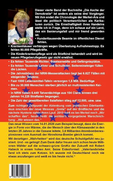 Dieses Buch ist das vierte seiner Reihe "Die Asche der Demokratie" und dokumentiert die politischen Ereignisse von März 2019 bis Februar 2020. Wir erleben den immer weiter schleichenden Verlust der Demokratie, zum Beispiel den Abschied der Volksparteien vom Volk, speziell das Dahinsiechen der "Arbeiterpartei" SPD, die ihrem sozialen Auftrag gegenüber ihren Wählern nicht mehr gerecht wird. Angefangen mit Gerhard Schröder und seiner Agenda 2010 über die Totgeburt des Heilsbringers Martin Schulz bis hin zu den Fragwürdigkeiten eines Bundespräsidenten Frank-Walter Steinmeier trieb die SPD unter Andrea Nahles ihren Selbstmord voran.Angela Merkel trat vom Parteivorsitz zurück und öffnete den Vorhang für ein Theaterstück, das Altmeister Friedrich Merz im Duell mit Merkels Wunschkandidatin Annegret Kramp-Karrenbauer mit dem notwendigen Spannungsbogen versah. Mit knapper Mehrheit beschenkt stieg AKK aufs Siegertreppchen, um zwar mit fähigerer Sprache, doch mit gleicher Schrittkombination die deutsche Zukunft weiter zu beMERKELn. Auch diese Ära geht ihrem Ende zu und die ©DU steht ebenfalls vor einem innerparteilichen Debakel, dessen positive Auflösung nicht sichtbar ist. Die neueste Herausforderung des Coronavirus zeigt abermals, dass die deutsche GroKo nicht handlungs- und entscheidungsfähig ist. Sie läuft den Ereignissen nur hinterher, statt selbst vorauszudenken, um diese Krise zu gestalten und somit zu meistern. Positive Beispiele, wie mit der Pandemie im europäischen Ausland verfahren wird, scheren die deutschen Politiker nicht. Sie glänzen vielmehr durch Gefährdung ihrer Bevölkerung als durch mutiges Auftreten.Die zu erwartende Zukunft in Deutschland ist eine tiefgrünrosarote Ideologiendiktatur, die WELT vor einiger Zeit schon mit den Worten verkündete: "Kramp-Karrenbauer und Göring-Eckardt offen für schwarz-grünes Bündnis."Damit geht der tägliche Irrsinn in Deutschland weiter und verändert dieses Land zusehends in rasantem Tempo. Die Autorin hat vier Jahre lang die Zerstörung der Demokratie, die Missachtung des Rechts, die Verfälschung der Realität durch die Mainstream-Medien, die Unterdrückung der Meinungsfreiheit, kurz: Die Spaltung einer ganzen Nation dokumentiert. Parallel dazu hat sie ihr Augenmerk auf die gesamte Politik der Kanzlerin gerichtet, die sich bis heute nicht scheut, gegen ihr Volk zu regieren, das Gegenteil zu tun von dem was sie sagte und die Rückumwandlung Deutschlands zur DDR 2.0 zu betreiben.Dieses Buch ist gemeinsam mit den drei
