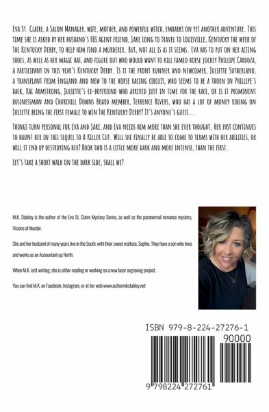 Eva St. Claire, a Salon Manager, wife, mother, and powerful witch, embarks on yet another adventure. This time she is asked by her husband's FBI agent friend, Jake Long to travel to Louisville, Kentucky the week of The Kentucky Derby, to help him find a murderer. But, not all is as it seems. Eva has to put on her acting shoes, as well as her magic hat, and figure out who would want to kill famed horse jockey Phillipe Cardoza, a participant in this year's Kentucky Derby. Is it the front runner and newcomer, Juliette Sutherland, a transplant from England and new to the horse racing circuit, who seems to be a thorn in Phillipe's back, Kai Armstrong, Juliette's ex-boyfriend who arrived just in time for the race, or is it prominent businessman and Churchill Downs Board member, Terrence Rivers, who has a lot of money riding on Juliette being the first female to win The Kentucky Derby? It's anyone's guess... Things turn personal for Eva and Jake, and Eva needs him more than she ever thought. Her past continues to haunt her in this sequel to A Killer Cut. Will she finally be able to come to terms with her abilities, or will it end up destroying her? Book two is a little more dark and more intense, than the first. Let's take a short walk on the dark side, shall we?