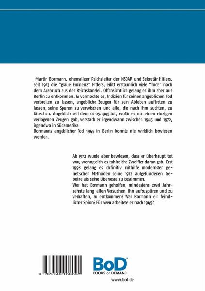 Martin Bormann, der ehemalige Reichsleiter der NSDAP und Sekretär Hitlers, auch als dessen Schatten bezeichnet, ist tot. Er wäre jetzt 118 Jahre alt. Die Zeiten von Methusalem sind allerdings schon sehr lange vorbei. Bormann starb nach allgemeiner Auffassung am 02.05.1945 in Berlin. Dennoch wurde er später zum Tode verurteilt und es wurde viele Jahre lang nach ihm gefahndet. Zahlreiche Meldungen über Sichtungen Bormanns in Europa, in Südamerika, ja sogar in den USA und in Ägypten sowie Festnahmen von Personen, die verdächtigt wurden, Bormann zu sein, machten ihn nach dem Krieg bekannter als er es vorher gewesen war. Die Frage, welche nach 1945 jahrzehntelang von verschiedenen Seiten gestellt wurde, die lautete: Wann und wo starb Bormann wirklich?Der SPIEGEL schrieb 1968: Von Anfang an glaubten ... viele Experten, dass Bormann die Flucht ins Ausland gelungen sei. Als man Anfang Dezember 1972 in Berlin Gebeine ausgrub, welche als die Bormanns bestätigt wurden, glaubte man, den FallBormann abgeschlossen zu haben. Es dauerte aber weitere 26 Jahre, also bis 1998, bis man die Identität der Gebeine als die Bormanns endgültig bestätigen konnte. Auch daran gab es danach weiter Zweifel, aber der Fall galt von nun an als endgültig gelöst.Man hatte mit modernsten Methoden herausgefunden, dass die Gebeine, die man 1972 in Berlin fand, von Bormann stammten, dass Bormann also tot war. Das wurde auch als Bestätigung dafür betrachtet, dass Bormann am 02.05.1945 in der Frühe in Berlin Selbstmord begangen habe. Dafür gibt es allerdings keine Beweise. Bewiesen wurde nur, dass Bormann spätestens am 07.12.1972 tot war. Es gibt zahlreiche Indizien dafür, dass er noch viele Jahre nach 1945 lebte. Wo aber lebte er und noch viel wichtiger, wie gelang es ihm zu entkommen, und wer half ihm dabei?Und für wen arbeitete Bormann nach seiner Flucht?