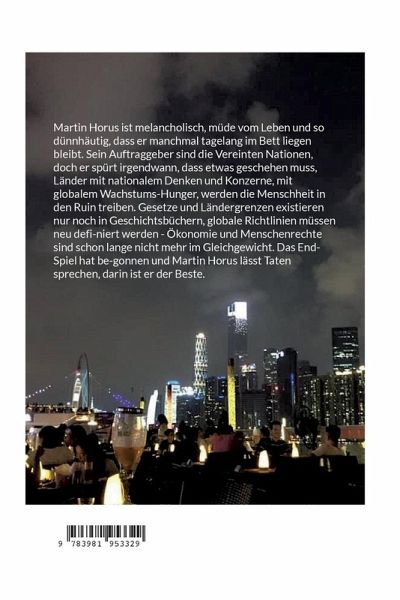 Martin Horus ist melancholisch, müde vom Leben und so dünnhäutig, dass er manchmal tagelang im Bett liegen bleibt. Sein Auftraggeber sind die Vereinten Nationen, doch er spürt irgendwann, dass etwas geschehen muss, Länder mit nationalem Denken und Konzerne, mit globalem Wachstums-Hunger, werden die Menschheit in den Ruin treiben. Gesetze und Ländergrenzen existieren nur noch in Geschichtsbüchern, globale Richtlinien müssen neu defi-niert werden - Ökonomie und Menschenrechte sind schon lange nicht mehr im Gleichgewicht. Das End-Spiel hat be-gonnen und Martin Horus lässt Taten sprechen, darin ist er der Beste.