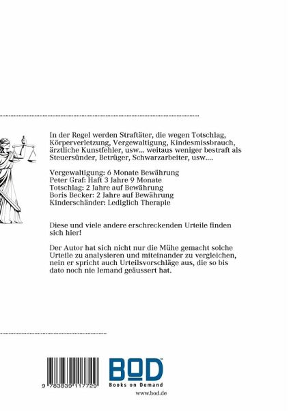 In der Regel werden Straftäter, die wegen Totschlag, Körperverletzung, Vergewaltigung, Kindesmissbrauch, ärztliche Kunstfehler, usw... weitaus weniger bestraft als Steuersünder, Betrüger, Schwarzarbeiter, usw.... Vergewaltigung: 6 Monate BewährungPeter Graf: Haft 3 Jahre 9 MonateTotschlag: 2 Jahre auf BewährungBoris Becker: 2 Jahre auf BewährungKinderschänder: Lediglich TherapieDiese und viele andere erschreckenden Urteile finden sich hier!Der Autor hat sich nicht nur die Mühe gemacht solche Urteile zu analysieren und miteinander zu vergleichen, nein er spricht auch Urteilsvorschläge aus, die so bis dato noch nie Jemand geäussert hat.