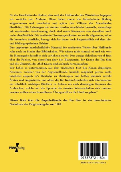 Wir haben es unternommen, aus dem arabischen Text des Kanon denjenigen Abschnitt, welcher von der Augenheilkunde handelt, möglichst getreu, nicht möglichst elegant, in's Deutsche zu übertragen, und hoffen dadurch sowohl Ärzten und Augenärzten und allen, die für Kultur-Geschichte sich interessieren, ein inhaltlich wichtiges Büchlein zu liefern, als auch denjenigen Kennern des Arabischen, welche mit der Sprache der exakten Wissenschaften sich vertraut machen wollen, einen brauchbaren Übungsstoff an die Hand zu geben."