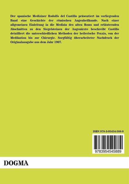 Der spanische Mediziner Rodolfo del Castillo präsentiert im vorliegenden Band eine Geschichte der römischen Augenheilkunde. Nach einer allgemeinen Einleitung in die Medizin des alten Roms und erläuternden Abschnitten zu den Siegelsteinen der Augenärzte beschreibt Castillo detailliert die unterschiedlichen Methoden der heilerische Praxis, von der Medikation bis zur Chirurgie. Sorgfältig überarbeiteter Nachdruck der Originalausgabe aus dem Jahr 1907.